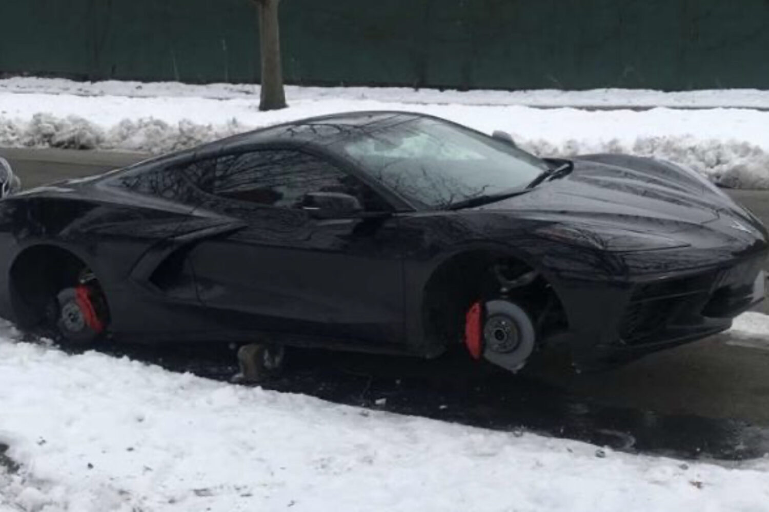 The poor mid-engined Corvette is now sitting on cinder blocks with its rear end resting on the ground, so it’s likely that the criminals inflicted some damage in the process of swiping the wheels.